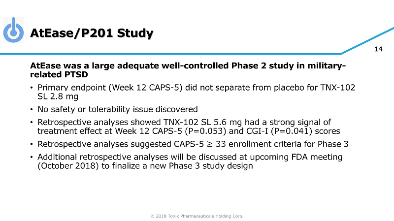 © 2018 Tonix Pharmaceuticals Holding Corp. 13 Phase 2 AtEase/P201 1 Study in Military - Related PTSD • Randomized, double - blind, placebo - controlled trial in military - related PTSD • Efficacy analysis from 231 * patients; 24 U.S. clinical sites • Enrolled patients with baseline CAPS - 5 2 ≥ 29 • Primary Efficacy Analysis: • Difference in CAPS - 5 score change from baseline between Tonmya 2.8 mg and placebo at Week 12 • Key Secondary Measures: • PROMIS Sleep Disturbance, CGI - I, SDS Tonmya at bedtime once - daily Placebo at bedtime once - daily 12 weeks N= 90 * Tonmya at bedtime once - daily N= 92 * N= 49 * 2.8 mg 5.6 mg (2 x 2.8 mg) open - label extension 1 ClinicalTrials.gov Identifier: NCT02277704 2 CAPS - 5 = Clinician - Administered PTSD Scale for DSM - 5 * Modified intent - to - treat