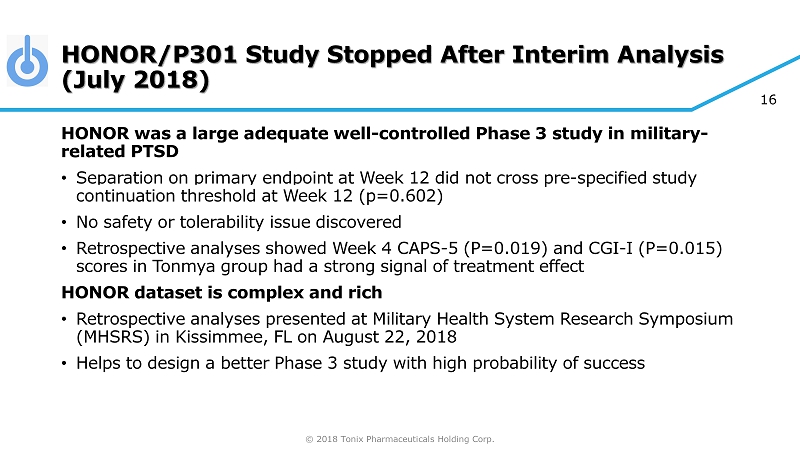© 2018 Tonix Pharmaceuticals Holding Corp. 15 HONOR/P301 1 Study – Evidence of Efficacy at Week 4 Discontinued Due to High Placebo Response at Week 12 Primary e ndpoint CAPS - 5 2 : • Mean change from baseline at W eek 12 (Tonmya 5.6 mg vs. placebo ) Unblinded interim analysis at 274 randomized participants ( mITT * N= 252) • Study stopped based on a pre - specified study continuation threshold at Week 12 • Participants discontinued in HONOR or 12 - week open - label extension (OLE) studies can enroll in the 40 - week OLE study Placebo once - daily at bedtime 12 weeks Tonmya once - daily at bedtime N= 127* N= 125* 5.6 mg (2 x 2.8 mg tablets) General s tudy c haracteristics: Randomized, double - blind, placebo - controlled , adaptive design, planned 550 military - related PTSD participants with baseline CAPS - 5 2 ≥ 33 in approximately 40 U.S. sites 12 - week and/or 40 - week open - label extension studies 1 ClinicalTrials.gov Identifier: NCT03062540 2 CAPS - 5 = Clinician - Administered PTSD Scale for DSM - 5 *Modified intent - to - treat