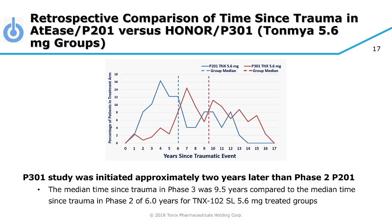 © 2018 Tonix Pharmaceuticals Holding Corp. 17 Retrospective Comparison of Time Since Trauma in AtEase/P201 versus HONOR/P301 (Tonmya 5.6 mg Groups) P301 study was initiated approximately two years later than Phase 2 P201 • The median time since trauma in Phase 3 was 9.5 years compared to the median time since trauma in Phase 2 of 6.0 years for TNX - 102 SL 5.6 mg treated groups