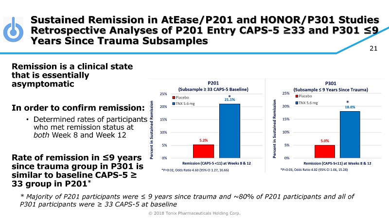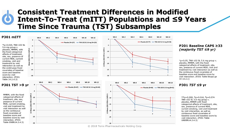 © 2018 Tonix Pharmaceuticals Holding Corp. Consistent Treatment Differences in Modified Intent - To - Treat ( mITT ) Populations and ≤9 Years Time Since Trauma (TST) Subsamples P301 mITT P201 Baseline CAPS ≥33 (majority TST ≤9 yr ) * p=0.020, TNX - 102 SL 5.6 mg group v. placebo, MMRM, with the fixed categorical effects of treatment, site, sex, presence of current MDE, current smoking, visit and treatment by visit interaction as well as the continuous fixed covariates of baseline score and baseline score by visit interaction. (P301 Table 14.2.4.3) *p<0.05, TNX - 102 SL 5.6 mg group v. placebo, MMRM, with the fixed categorical effects of treatment, site, sex, presence of current MDD, visit and treatment by visit interaction as well as the continuous fixed covariates of baseline score and baseline score by visit interaction. (P201 Table blcaps ge 33 14.2.1) P301 TST >9 yr P301 TST ≤9 yr ** p=0.008, * p=0.016, # p=0.074 TNX - 102 SL 5.6 mg group v. placebo, MMRM with fixed categorical effects of treatment, site, sex, presence of current MDE, current smoking, visit and treatment by visit interaction, as well as continuous fixed covariates of baseline score and baseline score by visit interaction. (P301 Table UNDER 14.2.4.3) MMRM, with the fixed categorical effects of treatment, site, sex, presence of current MDE, current smoking, visit and treatment by visit interaction as well as the continuous fixed covariates of baseline score and baseline score by visit interaction. (P301 Table OVER 14.2.4.3)
