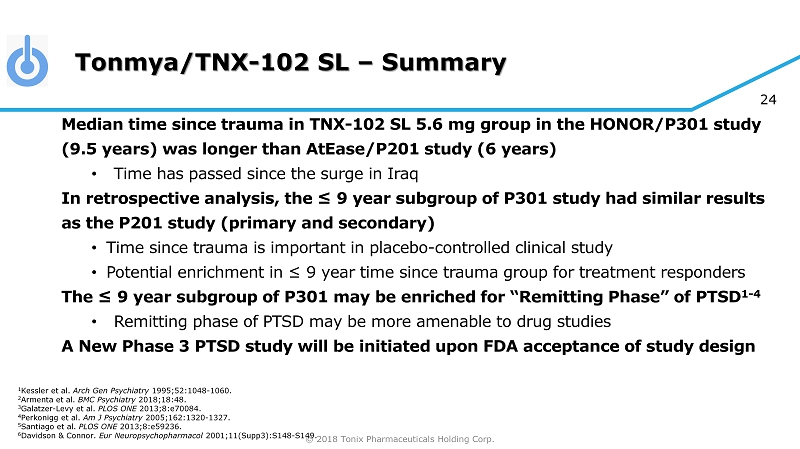 © 2018 Tonix Pharmaceuticals Holding Corp. 23 Time Since Trauma – Remitting and Persistent Phases of PTSD Kessler et al 1 studied remission in PTSD with and without therapy • Identified remitting and persistent phase of PTSD – with transition at approximately 6 years post trauma • Supported by other studies 2 - 6 1 Kessler et al. Arch Gen Psychiatry 1995;52:1048 - 1060. 2 Armenta et al. BMC Psychiatry 2018;18:48. 3 Galatzer - Levy et al. PLOS ONE 2013;8:e70084. 4 Perkonigg et al. Am J Psychiatry 2005;162:1320 - 1327. 5 Santiago et al. PLOS ONE 2013;8:e59236. 6 Davidson & Connor. Eur Neuropsychopharmacol 2001;11(Supp3):S148 - S149.