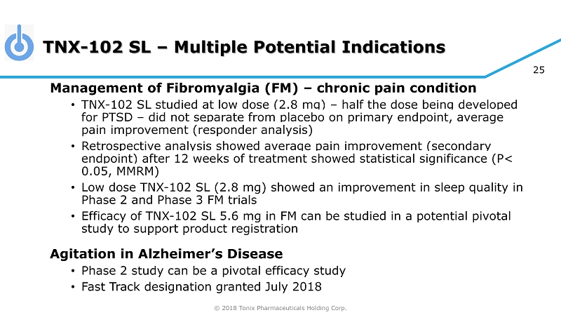© 2018 Tonix Pharmaceuticals Holding Corp. 24 Tonmya /TNX - 102 SL – Summary Median time since trauma in TNX - 102 SL 5.6 mg group in the HONOR/P301 study (9.5 years) was longer than AtEase/P201 study (6 years) • Time has passed since the surge in Iraq In retrospective analysis, the ≤ 9 year subgroup of P301 study had similar results as the P201 study (primary and secondary) • Time since trauma is important in placebo - controlled clinical study • Potential enrichment in ≤ 9 year time since trauma group for treatment responders The ≤ 9 year subgroup of P301 may be enriched for “Remitting Phase” of PTSD 1 - 4 • Remitting phase of PTSD may be more amenable to drug studies A New Phase 3 PTSD study will be initiated upon FDA acceptance of study design 1 Kessler et al. Arch Gen Psychiatry 1995;52:1048 - 1060. 2 Armenta et al. BMC Psychiatry 2018;18:48. 3 Galatzer - Levy et al. PLOS ONE 2013;8:e70084. 4 Perkonigg et al. Am J Psychiatry 2005;162:1320 - 1327. 5 Santiago et al. PLOS ONE 2013;8:e59236. 6 Davidson & Connor. Eur Neuropsychopharmacol 2001;11(Supp3):S148 - S149.