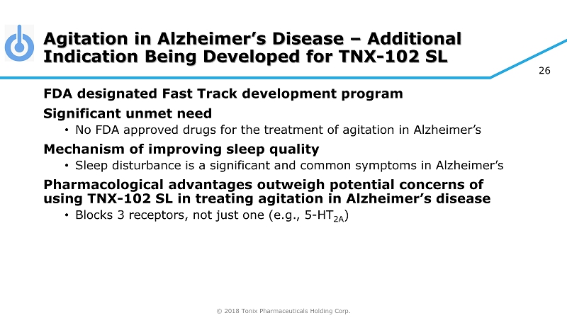 © 2018 Tonix Pharmaceuticals Holding Corp. 25 TNX - 102 SL – Multiple Potential Indications Ma nagement of Fibromyalgia (FM) – chronic pain condition • TNX - 102 SL studied at low dose (2.8 mg) – half the dose being developed for PTSD – did not separate from placebo on primary endpoint, average pain improvement (responder analysis) • Retrospective analysis showed average pain improvement (secondary endpoint) after 12 weeks of treatment showed statistical significance (P< 0.05, MMRM) • Low dose TNX - 102 SL (2.8 mg) showed an improvement in sleep quality in Phase 2 and Pha se 3 FM trials • Efficacy of TNX - 102 SL 5.6 mg in FM can be studied in a potential pivotal study to support product registration Agitation in Alzheimer’s Disease • Phase 2 study can be a pivotal efficacy study • Fast Track designation granted July 2018