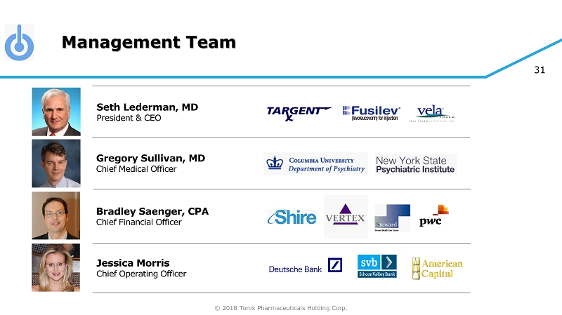 © 2018 Tonix Pharmaceuticals Holding Corp. 30 TNX - 801 (Synthesized Live Horsepox Virus): A Smallpox - Preventing Vaccine Candidate Pre - IND Stage Potential improvement over current biodefense tools against smallpox ✓ Leverages Tonix’s government affairs effort ✓ Collaboration with Professor David Evans and Dr. Ryan Noyce at University of Alberta ✓ Demonstrated protective vaccine activity in mice ✓ Patent application on novel vaccine submitted Regulatory strategy • We intend to meet with FDA to discuss the most efficient and appropriate investigational plan to support the licensure, either: ✓ Application of the “Animal Rule”, or ✓ Conducting an active comparator study using ACAM2000 • Good Manufacturing Practice (GMP) viral production process in development Targeting a Potential Public Health Issue Material threat medical countermeasure under 21 st Century Cures Act • Qualifies for Priority Review Voucher* (PRV) upon licensure ✓ PRVs have no expiration date, are transferrable and have sold for ~$125 M 1 PRV can be applied to any BLA/NDA for priority 6 - month review
