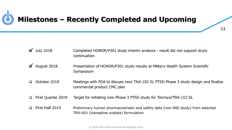 © 2018 Tonix Pharmaceuticals Holding Corp. 32 Board of Directors Seth Lederman, MD Chairman Adeoye “Oye” Olukotun, MD Squibb, BMS, Mallinckrodt, Esperion John Rhodes Chair, NYS Public Service Commission, CEO, NYS Dept. of Public Service, Booz Allen Charles Mather BTIG, Janney, Jefferies, Cowen, Smith Barney Gen. David Grange (ret.) Pharm - Olam, PPD, McCormick Foundation Patrick Grace ( qp ) global family offices, Grace Institute Foundation, WR Grace, Chemed Donald Landry, MD, PhD Chair of Medicine, Columbia University Margaret Smith Bell Standard Life Investments, Putnam Investments, State Street Research