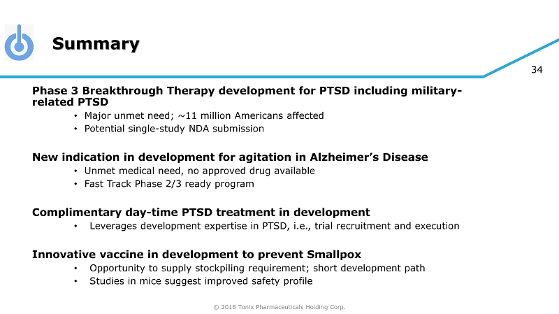 © 2018 Tonix Pharmaceuticals Holding Corp. 33 Milestones – Recently Completed and Upcoming □ July 201 8 Completed HONOR/P301 study interim analysis - result did not support study continuation □ August 201 8 Presentation of HONOR/P301 study results at Military Health System Scientific Symposium □ October 201 8 Meetings with FDA to discuss next TNX - 102 SL PTSD Phase 3 study design and finalize commercial product CMC plan □ First Quarter 2019 Target for initiating new Phase 3 PTSD study for Tonmya/TNX - 102 SL □ First Half 2019 Preliminary human pharmacokinetic and safety data (non - IND study) from selected TNX - 601 (tianeptine oxalate) formulation x x