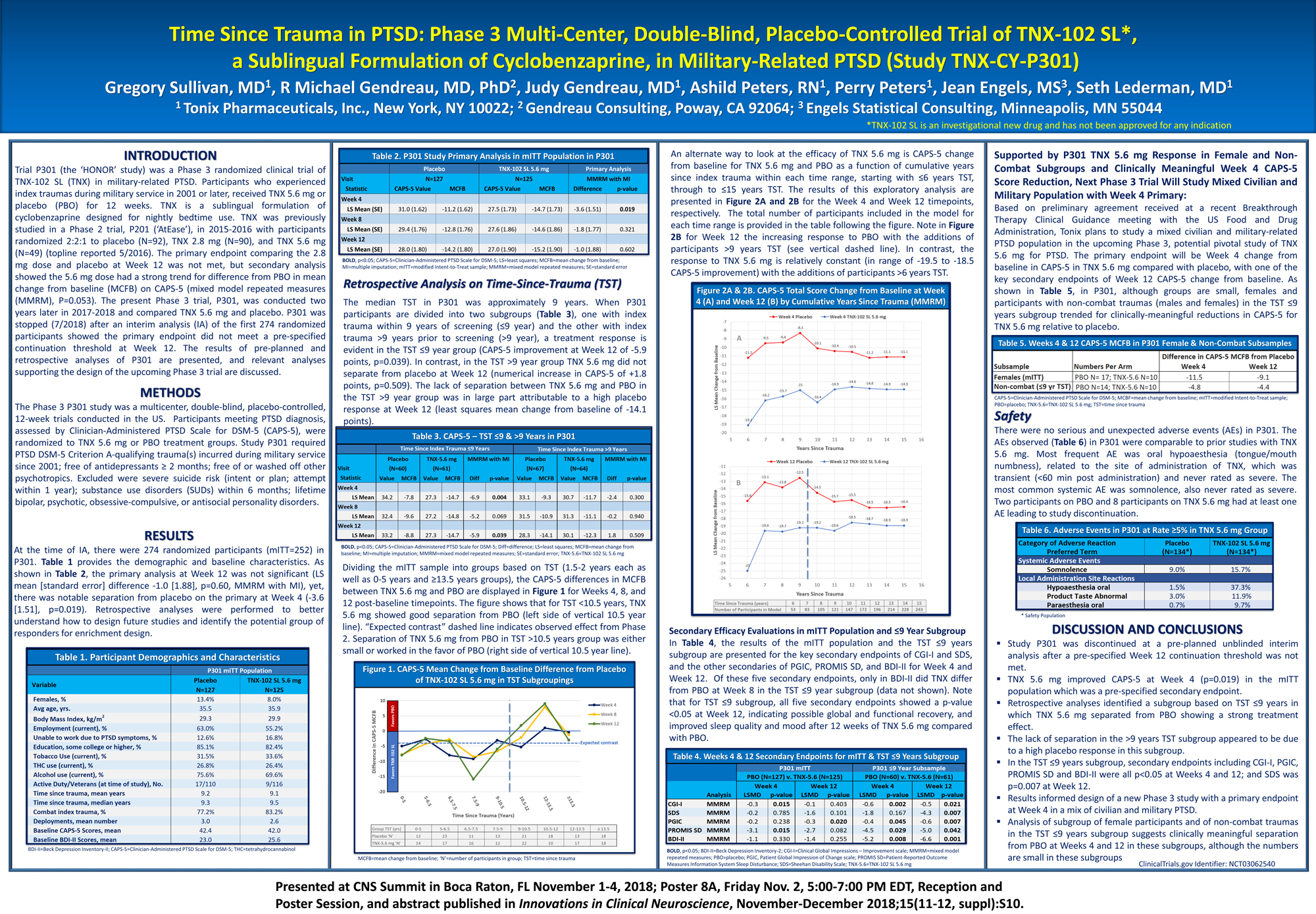Time Since Trauma in PTSD: Phase 3 Multi - Center, Double - Blind, Placebo - Controlled Trial of TNX - 102 SL*, a Sublingual Formulation of Cyclobenzaprine, in Military - Related PTSD (Study TNX - CY - P301) Gregory Sullivan, MD 1 , R Michael Gendreau, MD, PhD 2 , Judy Gendreau, MD 1 , Ashild Peters, RN 1 , Perry Peters 1 , Jean Engels, MS 3 , Seth Lederman, MD 1 1 Tonix Pharmaceuticals, Inc., New York, NY 10022; 2 Gendreau Consulting, Poway, CA 92064; 3 Engels Statistical Consulting, Minneapolis, MN 55044 INTRODUCTION Trial P 301 (the ‘HONOR’ study) was a Phase 3 randomized clinical trial of TNX - 102 SL (TNX) in military - related PTSD . Participants who experienced index traumas during military service in 2001 or later, received TNX 5 . 6 mg or placebo (PBO) for 12 weeks . TNX is a sublingual formulation of cyclobenzaprine designed for nightly bedtime use . TNX was previously studied in a Phase 2 trial, P 201 (‘ AtEase ’), in 2015 - 2016 with participants randomized 2 : 2 : 1 to placebo (N= 92 ), TNX 2 . 8 mg (N= 90 ), and TNX 5 . 6 mg (N= 49 ) (topline reported 5 / 2016 ) . The primary endpoint comparing the 2 . 8 mg dose and placebo at Week 12 was not met, but secondary analysis showed the 5 . 6 mg dose had a strong trend for difference from PBO in mean change from baseline (MCFB) on CAPS - 5 (mixed model repeated measures (MMRM), P= 0 . 053 ) . The present Phase 3 trial, P 301 , was conducted two years later in 2017 - 2018 and compared TNX 5 . 6 mg and placebo . P 301 was stopped ( 7 / 2018 ) after an interim analysis (IA) of the first 274 randomized participants showed the primary endpoint did not meet a pre - specified continuation threshold at Week 12 . The results of pre - planned and retrospective analyses of P 301 are presented, and relevant analyses supporting the design of the upcoming Phase 3 trial are discussed . METHODS The Phase 3 P 301 study was a multicenter, double - blind, placebo - controlled, 12 - week trials conducted in the US . Participants meeting PTSD diagnosis, assessed by Clinician - Administered PTSD Scale for DSM - 5 (CAPS - 5 ), were randomized to TNX 5 . 6 mg or PBO treatment groups . Study P 301 required PTSD DSM - 5 Criterion A - qualifying trauma(s) incurred during military service since 2001 ; free of antidepressants ≥ 2 months ; free of or washed off other psychotropics . Excluded were severe suicide risk (intent or plan ; attempt within 1 year) ; substance use disorders (SUDs) within 6 months ; lifetime bipolar, psychotic, obsessive - compulsive, or antisocial personality disorders . ClinicalTrials.gov Identifier: NCT03062540 *TNX - 102 SL is an investigational new drug and has not been approved for any indication CAPS - 5=Clinician - Administered PTSD Scale for DSM - 5; MCBF=mean change from baseline; mITT =modified Intent - to - Treat sample; PBO=placebo; TNX - 5.6=TNX - 102 SL 5.6 mg; TST=time since trauma Safety There were no serious and unexpected adverse events (AEs) in P 301 . The AEs observed ( Table 6 ) in P 301 were comparable to prior studies with TNX 5 . 6 mg . Most frequent AE was oral hypoaesthesia (tongue/mouth numbness), related to the site of administration of TNX, which was transient (< 60 min post administration) and never rated as severe . The most common systemic AE was somnolence, also never rated as severe . Two participants on PBO and 8 participants on TNX 5 . 6 mg had at least one AE leading to study discontinuation . BDI - II=Beck Depression Inventory - II; CAPS - 5=Clinician - Administered PTSD Scale for DSM - 5; THC=tetrahydrocannabinol RESULTS At the time of IA, there were 274 randomized participants ( mITT = 252 ) in P 301 . Table 1 provides the demographic and baseline characteristics . As shown in Table 2 , the primary analysis at Week 12 was not significant (LS mean [standard error] difference - 1 . 0 [ 1 . 88 ], p= 0 . 60 , MMRM with MI), yet, there was notable separation from placebo on the primary at Week 4 ( - 3 . 6 [ 1 . 51 ], p= 0 . 019 ) . Retrospective analyses were performed to better understand how to design future studies and identify the potential group of responders for enrichment design . Retrospective Analysis on Time - Since - Trauma (TST) The median TST in P 301 was approximately 9 years . When P 301 participants are divided into two subgroups ( Table 3 ), one with index trauma within 9 years of screening (≤ 9 year) and the other with index trauma > 9 years prior to screening (> 9 year), a treatment response is evident in the TST ≤ 9 year group (CAPS - 5 improvement at Week 12 of - 5 . 9 points, p= 0 . 039 ) . In contrast, in the TST > 9 year group TNX 5 . 6 mg did not separate from placebo at Week 12 (numerical increase in CAPS - 5 of + 1 . 8 points, p= 0 . 509 ) . The lack of separation between TNX 5 . 6 mg and PBO in the TST > 9 year group was in large part attributable to a high placebo response at Week 12 (least squares mean change from baseline of - 14 . 1 points) . DISCUSSION AND CONCLUSIONS ▪ Study P 301 was discontinued at a pre - planned unblinded interim analysis after a pre - specified Week 12 continuation threshold was not met . ▪ TNX 5 . 6 mg improved CAPS - 5 at Week 4 (p= 0 . 019 ) in the mITT population which was a pre - specified secondary endpoint . ▪ Retrospective analyses identified a subgroup based on TST ≤ 9 years in which TNX 5 . 6 mg separated from PBO showing a strong treatment effect . ▪ The lack of separation in the > 9 years TST subgroup appeared to be due to a high placebo response in this subgroup . ▪ In the TST ≤ 9 years subgroup, secondary endpoints including CGI - I, PGIC, PROMIS SD and BDI - II were all p< 0 . 05 at Weeks 4 and 12 ; and SDS was p= 0 . 007 at Week 12 . ▪ Results informed design of a new Phase 3 study with a primary endpoint at Week 4 in a mix of civilian and military PTSD . ▪ Analysis of subgroup of female participants and of non - combat traumas in the TST ≤ 9 years subgroup suggests clinically meaningful separati