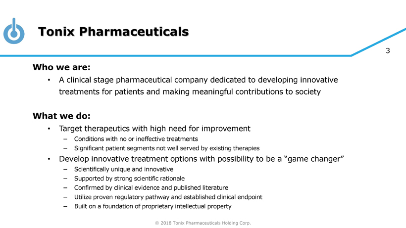 © 2018 Tonix Pharmaceuticals Holding Corp. 2 Cautionary Note on Forward - Looking Statements Certain statements in this presentation regarding strategic plans, expectations and objectives for future operations or results are “forward - looking statements” as defined by the Private Securities Litigation Reform Act of 1995 . These statements may be identified by the use of forward - looking words such as “anticipate,” “believe,” “forecast,” “estimate” and “intend,” among others . These forward - looking statements are based on Tonix’s current expectations and actual results could differ materially . There are a number of factors that could cause actual events to differ materially from those indicated by such forward - looking statements . These factors include, but are not limited to, substantial competition ; our need for additional financing ; uncertainties of patent protection and litigation ; uncertainties of government or third party payor reimbursement ; limited research and development efforts and dependence upon third parties ; and risks related to failure to obtain U . S . Food and Drug Administration clearances or approvals and noncompliance with its regulations . As with any pharmaceutical under development, there are significant risks in the development, regulatory approval and commercialization of new products . The forward - looking statements in this presentation are made as of the date of this presentation, even if subsequently made available by Tonix on its website or otherwise . Tonix does not undertake an obligation to update or revise any forward - looking statement, except as required by law . Investors should read the risk factors set forth in the Annual Report on Form 10 - K for the year ended December 31 , 2017 , as filed with the Securities and Exchange Commission (the “SEC”) on March 9 , 2018 , and periodic reports filed with the SEC on or after the date thereof . All of Tonix's forward - looking statements are expressly qualified by all such risk factors and other cautionary statements .
