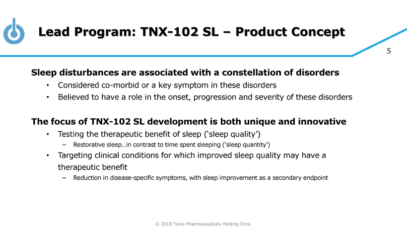 © 2018 Tonix Pharmaceuticals Holding Corp. 4 Tonmya ®1 – lead program; FDA Breakthrough Therapy for Posttraumatic Stress Disorder (PTSD) – Bedtime treatment in Phase 3 Development • Results from 2 efficacy studies improve the new Phase 3 study design • New Phase 3 P302/RECOVERY study design features accepted by the FDA 2 • P302/RECOVERY study with Week 4 primary endpoint to initiate in 1Q2019 TNX - 102 SL – FDA Fast Track development program for agitation in Alzheimer’s disease (AAD) • IND 3 ready to support Phase 2 potential pivotal efficacy study TNX - 601 4 - Pre - IND candidate for daytime treatment for PTSD • Nonclinical development ongoing TNX - 801 5 - Smallpox - preventing vaccine candidate • Efficacy demonstrated in mouse model • cGMP process development underway 1 Tonmya has been conditionally accepted by the U.S. FDA as the proposed trade name for TNX - 102 SL (cyclobenzaprine HCl sublingual tablets) for the treatment of PTSD. TNX - 102 SL is an investigational new drug and has not been approved for any indication. 2 FDA Breakthrough Therapy Type B Clinical Guidance Meeting Minutes (November 26, 2018) 3 IND - Investigational New Drug Application 4 T ianeptine oxalate 5 S ynthesized live horsepox virus Tonix Development Highlights Cyclobenzaprine Sublingual Tablets Pipeline