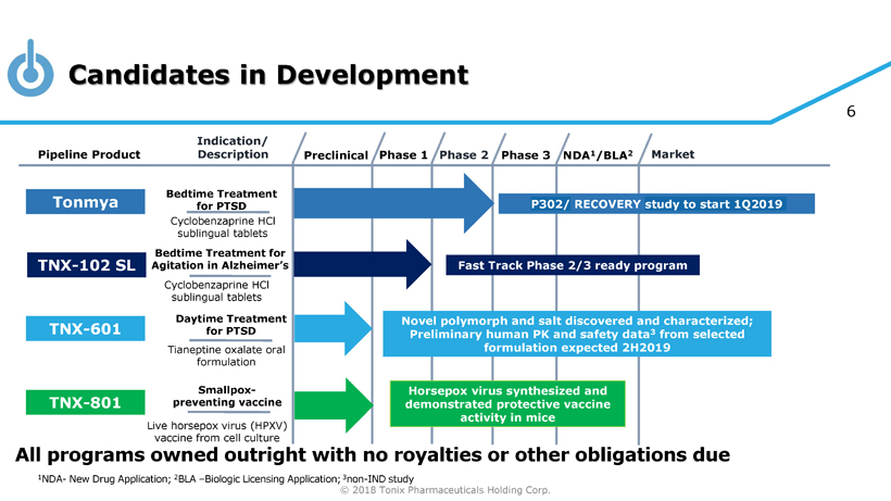 © 2018 Tonix Pharmaceuticals Holding Corp. 5 Lead Program: TNX - 102 SL – Product Concept Sleep disturbances are associated with a constellation of disorders • Considered co - morbid or a key symptom in these disorders • Believed to have a role in the onset, progression and severity of these disorders The focus of TNX - 102 SL development is both unique and innovative • Testing the therapeutic benefit of sleep (‘sleep quality’) − Restorative sleep…in contrast to time spent sleeping (‘sleep quantity’) • Targeting clinical conditions for which improved sleep quality may have a therapeutic benefit − Reduction in disease - specific symptoms, with sleep improvement as a secondary endpoint