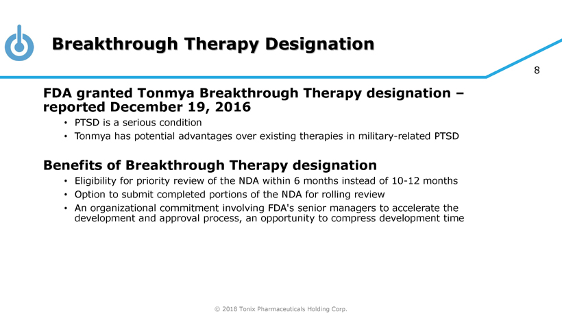 © 2018 Tonix Pharmaceuticals Holding Corp. 7 Tonmya for the Treatment of PTSD Breakthrough Therapy (BT) designation from the FDA • Expedited development and accelerated approval are expected One Phase 2 study completed and one Phase 3 study stopped early due to inadequate separation from placebo (unblinded interim analysis of ~50% participants) • Both studies were accepted by the FDA as potential pivotal efficacy studies in military - related PTSD if successful • No safety or tolerability concerns • Phase 2 study (P201) formed the basis of BT designation • Phase 3 study (P301) provided evidence of effectiveness as early as 4 weeks after treatment but diminished over time due to high placebo response − Retrospective analysis showed Tonmya response in subgroup with trauma ≤9 years from screening • Both studies can be used as supportive evidence of efficacy and safety for Tonmya NDA submission FDA feedback and acceptance on new Phase 3 study (P302) received in November 1 Patent protection through 2034 in U.S. 2 • Composition of matter patent for transmucosal delivery of cyclobenzaprine Novel mechanism targets sleep quality • Memory processing during sleep is important to recovery from PTSD 1 FDA Breakthrough Therapy Type B Clinical Guidance Meeting Minutes, November 26, 2018; 2 U .S. Patent No. 9,636,408 for eutectic proprietary Protectic ™ formulation