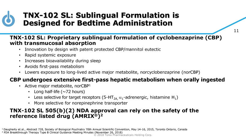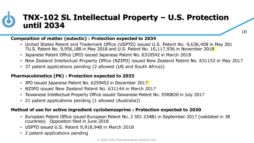 © 2018 Tonix Pharmaceuticals Holding Corp. 10 TNX - 102 SL Intellectual Property – U.S. Protection until 2034 Composition of matter (eutectic) : Protection expected to 2034 • United States Patent and Trademark Office (USPTO) issued U.S. Patent No. 9,636,408 in May 201 7U.S. Patent No. 9,956,188 in May 2018 and U.S. Patent No. 10,117,936 in November 2018 • Japanese Patent Office (JPO) issued Japanese Patent No. 6310542 in March 2018 • New Zealand Intellectual Property Office (NZIPO) issued New Zealand Patent No. 631152 in May 2017 • 37 patent applications pending (2 allowed (US and South Africa)) Pharmacokinetics (PK) : Protection expected to 2033 • JPO issued Japanese Patent No. 6259452 in December 2017 • NZIPO issued New Zealand Patent No. 631144 in March 2017 • Taiwanese Intellectual Property Office issued Taiwanese Patent No. I590820 in July 2017 • 21 patent applications pending (1 allowed (Australia)) Method of use for active ingredient cyclobenzaprine : Protection expected to 2030 • European Patent Office issued European Patent No. 2 501 234B1 in September 2017 (validated in 38 countries). Opposition filed in June 2018 • USPTO issued U.S. Patent 9,918,948 in March 2018 • 2 patent applications pending