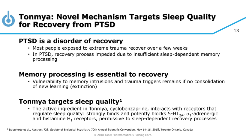 © 2018 Tonix Pharmaceuticals Holding Corp. 13 Tonmya: Novel Mechanism Targets Sleep Quality for Recovery from PTSD PTSD is a disorder of recovery • Most people exposed to extreme trauma recover over a few weeks • In PTSD, recovery process impeded due to insufficient sleep - dependent memory processing Memory processing is essential to recovery • Vulnerability to memory intrusions and trauma triggers remains if no consolidation of new learning (extinction) Tonmya targets sleep quality 1 • The active ingredient in Tonmya, cyclobenzaprine, interacts with receptors that regulate sleep quality: strongly binds and potently blocks 5 - HT 2A , a 1 - adrenergic and histamine H 1 receptors, permissive to sleep - dependent recovery processes 1 Daugherty et al., Abstract 728, Society of Biological Psychiatry 70th Annual Scientific Convention, May 14 - 16, 2015, Toronto On tario, Canada