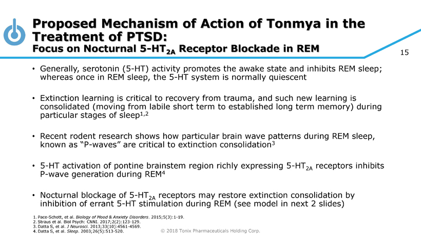 © 2018 Tonix Pharmaceuticals Holding Corp. 14 Proposed Mechanism of Action of Tonmya in the Treatment of PTSD: The Effects of Nocturnal Neuroreceptor Blockade on Sleep Cyclobenzaprine is a functional antagonist at serotonergic 5 - HT 2A receptors , noradrenergic 1 receptors , and histaminergic H 1 receptors REM, rapid eye movement; NREM, non - rapid eye movement; P - waves, ponto - geniculo - occipital waves Serotonergic projections from the dorsal raphe nuclei Inhibition of 5 - HT 2A receptors: Slow - wave sleep NREM spindles REM P - waves Noradrenergic projections from the locus coeruleus Inhibition of 1 receptors: REM fragmentation Total sleep time Histaminergic projections from the tuberomammillary nucleus Inhibition of H 1 receptors: NREM Wakefulness The overall proposed effects of Tonmya on sleep leads to increased sleep - dependent consolidation of extinction memories, facilitating recovery from PTSD