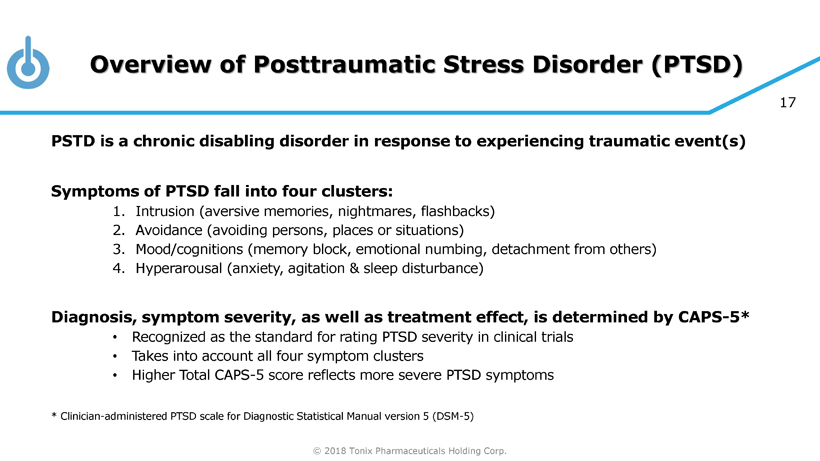 © 2018 Tonix Pharmaceuticals Holding Corp. 16 Fear Extinction Memory Consolidation: The Proposed Role of P - Waves, REM Sleep, and Serotonergic Neuroreceptor Activity Serotonergic projections from the dorsal raphe nuclei pons Site of release of phasic waves called pontine or P - waves P - wave activity is highest right before and during REM sleep 1 • Serotonergic activity normally inhibits P - wave release during REM sleep 2 • This is thought to be done primarily through activity at 5 - HT 2A receptors 3 • Increased P - wave activity during REM sleep is critical for fear extinction memory consolidation in rats 4 • By blocking 5 - HT 2A receptors, cyclobenzaprine may sustain P - wave activity during REM sleep • This blockade may lead to better quality of REM sleep with increased fear extinction consolidation in individuals with PTSD, facilitating recovery P - waves, ponto - geniculo - occipital waves; REM, rapid eye movement 1. Lim AS, et al. Sleep . 2007;30(7):823 - 827. 2. Datta S, et al. Sleep . 2003;26(5):513 - 520. 3. Tamas K, Gyorgy B. Effect of 5 - HT2A/2B/2C receptor agonists and antagonists on sleep and waking in laboratory animals and humans. In: Monti JM, Pandi - Perumal SR, Jacobs BL, Nutt DJ, eds. Serotonin and sleep: Molecular, functional, and clinical aspects. Basel, Switzerland: Birkhäuser Basel; 2008. 4. Datta S, et al. J Neurosci . 2013;33(10):4561 - 4569.