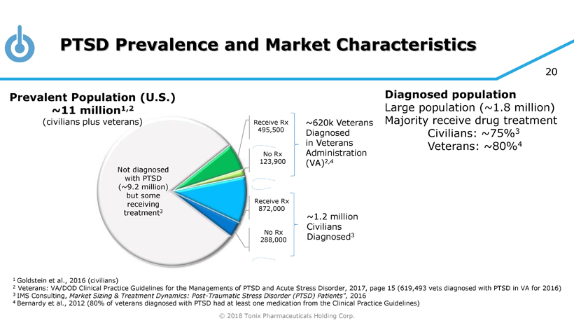 © 2018 Tonix Pharmaceuticals Holding Corp. 19 PTSD: U.S. Prevalence and Index Traumas PTSD is a chronic response to traumatic event(s) • A majority of people will experience a traumatic event at some point in their lifetime 1 • 20% of women and 8% of men in the U.S. who experience significant trauma develop PTSD 1 Adult Civilians: • Lifetime prevalence: 6.1% (14.4 million adults in the U.S.) 2 • Persistent - >1/3 fail to recover, even after several years following the trauma 2 • Twelve month prevalence: U.S. 4.7 % (11 million adults) 2 EU 2.3% (~10.0 million adults) 3 Most common forms of trauma 1 • Witnessing someone being badly injured or killed • Natural disaster • Life - threatening accident • Sexual or physical assault 1 Kessler et al., Arch Gen Psychiatry 1995; 52:1048 2 Goldstein et al., 2016 3 The European Union Market Potential for a New PTSD Drug. Prepared for Tonix Pharmaceuticals by Procela Consultants Ltd, Sept emb er 2016