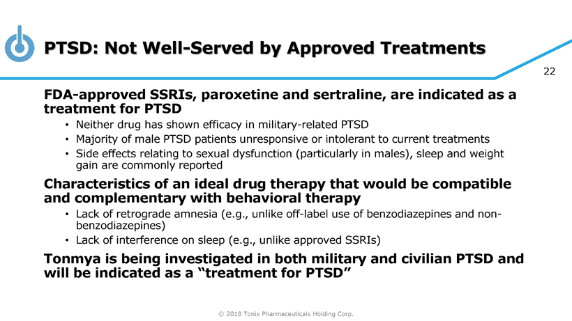 © 2018 Tonix Pharmaceuticals Holding Corp. 21 What Drug Classes are Used to Treat PTSD? * TRx = Total prescriptions 1 VA/DoD Clinical Practice Guideline for the Management of Post - Traumatic Stress, Version 2, 2010 2 IMS Consulting, Market Sizing & Treatment Dynamics: “Post - Traumatic Stress Disorder (PTSD) Patients", 2016 Benzodiazepines 2.845 M TRx SSRIs 2.839 M TRx Other Antidepressants Non - benzodiazepine Hypnotics Serotonin and norepinephrine reuptake inhibitors (SNRIs) Tricyclic Antidepressants Adrenergic Agents All Others Atypical Antipsychotics Anticonvulsants/Mood Stabilizers Market highly fragmented, with benzodiazepines widely prescribed (but not indicated) 1 • Multiple medications per patient (or “Polypharmacy”) is the norm • Approximately 55% of patients receive a benzodiazepine, and 53% receive a selective serotonin reuptake inhibitor (SSRI) • SSRIs are the only FDA - approved drug class Estimated PTSD Market Volume (Civilian Population Only) ~14.1 million TRx * 2