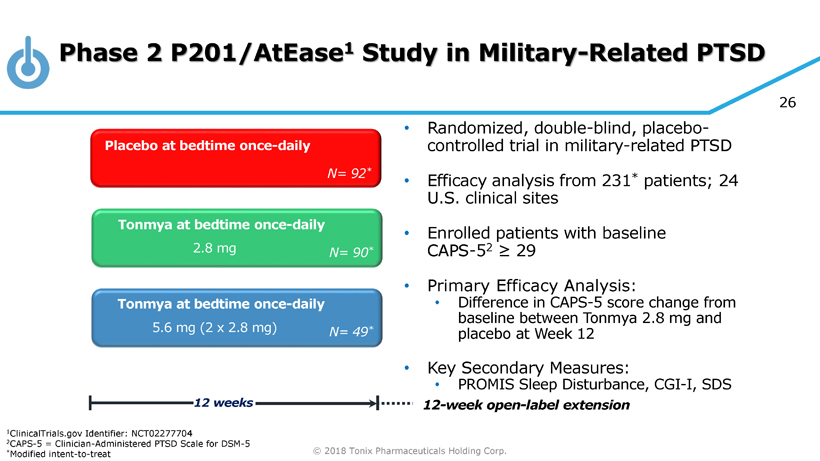 © 2018 Tonix Pharmaceuticals Holding Corp. 25 Growing Economic and Social Burden to Care for Veterans with PTSD Health care costs associated with PTSD for OEF/OIF/OND veterans: Direct costs Indirect costs 1 CBO Report 2012; 2 Tanielan , Invisible Wounds of War . 2005; 3 Analysis of VA Health Care Utilization among Operation Enduring Freedom, Operation Iraqi Freedom, and Operation New Dawn Veterans, from 1st Qtr FY 2002 through 2nd Qtr FY 2015, Washington, DC ; OEF/OIF/OND, Operations Enduring Freedom, Iraqi Freedom and New Dawn. $3,000 - 5,000 per patient per year for OEF/OIF Veterans 1 ~ 1.9M Veterans out of 2.7M Service members deployed between 10/1/2001 and 3/31/2015 3 $2 - 3 billion estimated yearly cost to society 2 Families, social care agencies, schools, employers, welfare system 2
