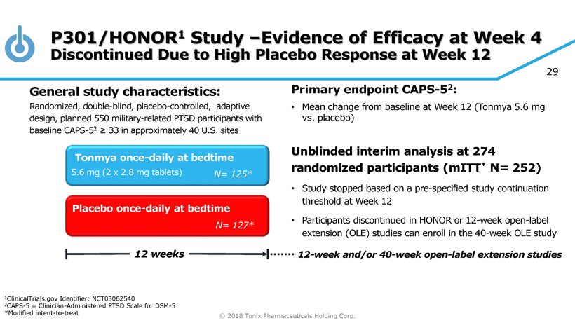 © 2018 Tonix Pharmaceuticals Holding Corp. 29 P301/HONOR 1 Study – Evidence of Efficacy at Week 4 Discontinued Due to High Placebo Response at Week 12 Primary e ndpoint CAPS - 5 2 : • Mean change from baseline at W eek 12 (Tonmya 5.6 mg vs. placebo ) Unblinded interim analysis at 274 randomized participants ( mITT * N= 252) • Study stopped based on a pre - specified study continuation threshold at Week 12 • Participants discontinued in HONOR or 12 - week open - label extension (OLE) studies can enroll in the 40 - week OLE study Placebo once - daily at bedtime 12 weeks Tonmya once - daily at bedtime N= 127* N= 125* 5.6 mg (2 x 2.8 mg tablets) General s tudy c haracteristics: Randomized, double - blind, placebo - controlled , adaptive design, planned 550 military - related PTSD participants with baseline CAPS - 5 2 ≥ 33 in approximately 40 U.S. sites 12 - week and/or 40 - week open - label extension studies 1 ClinicalTrials.gov Identifier: NCT03062540 2 CAPS - 5 = Clinician - Administered PTSD Scale for DSM - 5 *Modified intent - to - treat