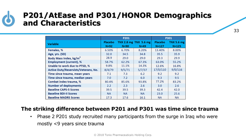 © 2018 Tonix Pharmaceuticals Holding Corp. 32 Differences Between P201/AtEase and P301/HONOR Studies Design Phase 2 and 3 studies were very similar – both studied military related PTSD at multiple sites in the US • CAPS - 5 ≥ 33 entry criteria used in Phase 3 BDI - II= Beck Depression Inventory - II; CGI - I=Clinical Global Impression – Improvement; MI= multiple imputation; MMRM=mixed model repeated measures; MADRS=Montgomery - Åsberg Depression Rating Scale; PROMIS SD=Patient - Reported Outcomes Measurement Information System – Sleep Disturbance; SDS=Sheehan Disability Scale; TFT=trauma - focused therapy