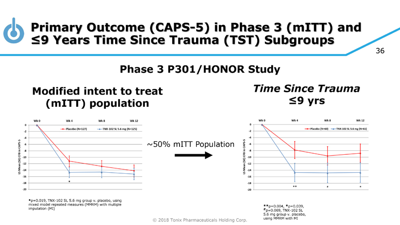 © 2018 Tonix Pharmaceuticals Holding Corp. 35 CAPS - 5 Mean Change from Baseline Difference from Placebo of Tonmya 5.6 mg in TST Subgroupings MCFB=mean change from baseline; ‘N’=number of participants in group; PBO=placebo; TST=time since trauma • The mITT sample was divided into groups based on TST ( 1 . 5 - 2 years each as well as 0 - 5 years and ≥ 13 . 5 years groups) • Graph shows the CAPS - 5 differences in MCFB between TNX 5 . 6 mg and PBO for Weeks 4 , 8 , and 12 post - baseline timepoints • “Expected contrast” horizontal dashed line indicates observed effect from Phase 2 P 201 study • For TST < 10 . 5 years groups, TNX 5 . 6 mg showed good separation from PBO (left side of vertical dashed 10 . 5 year line) . • For TST > 10 . 5 years groups, separation of TNX 5 . 6 mg from PBO was either small or worked in the favor of PBO (right side of vertical dashed 10 . 5 year line) .