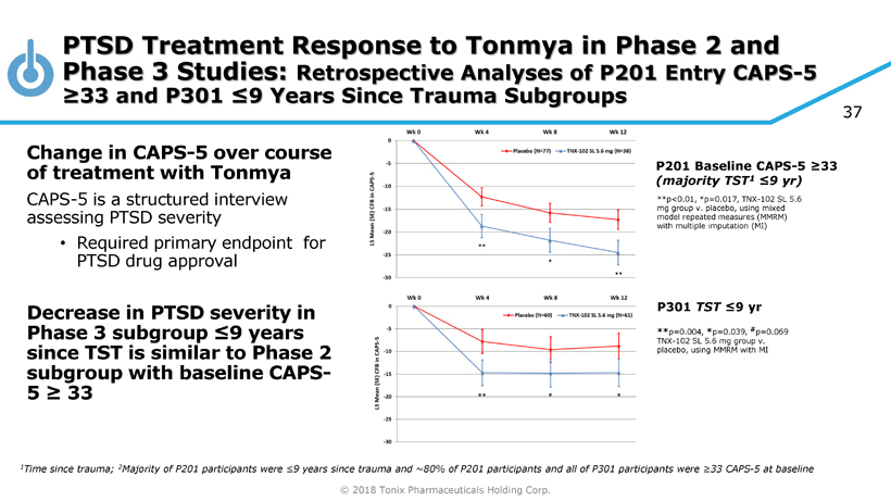 © 2018 Tonix Pharmaceuticals Holding Corp. Primary Outcome (CAPS - 5) in Phase 3 ( mITT ) and ≤9 Years Time Since Trauma (TST) Subgroups Modified intent to treat ( mITT ) population Phase 3 P301/HONOR Study ** p=0.004, * p=0.039, # p=0.069, TNX - 102 SL 5.6 mg group v. placebo, using MMRM with MI ~50% mITT Population 36 * p=0.019, TNX - 102 SL 5.6 mg group v. placebo, using mixed model repeated measures (MMRM) with multiple imputation (MI) Time Since Trauma ≤9 yrs