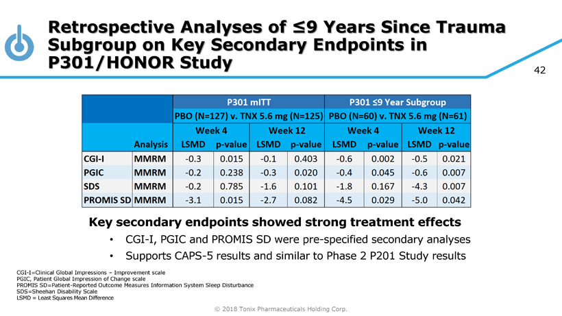 © 2018 Tonix Pharmaceuticals Holding Corp. 41 Retrospective Analysis of Treatment Response in ≤9 & >9 Years since Trauma in P301/HONOR Study The ≤ 9 years since trauma group in P301 replicated results from P201 • Retrospective analysis of P201 showed Tonmya 5.6 mg treatment group difference over placebo of 5.0 points (MMRM with MI, p = 0.031) LS Mean = Least Squares Mean MCFB = Mean Change From Baseline MMRM with Multiple Imputation