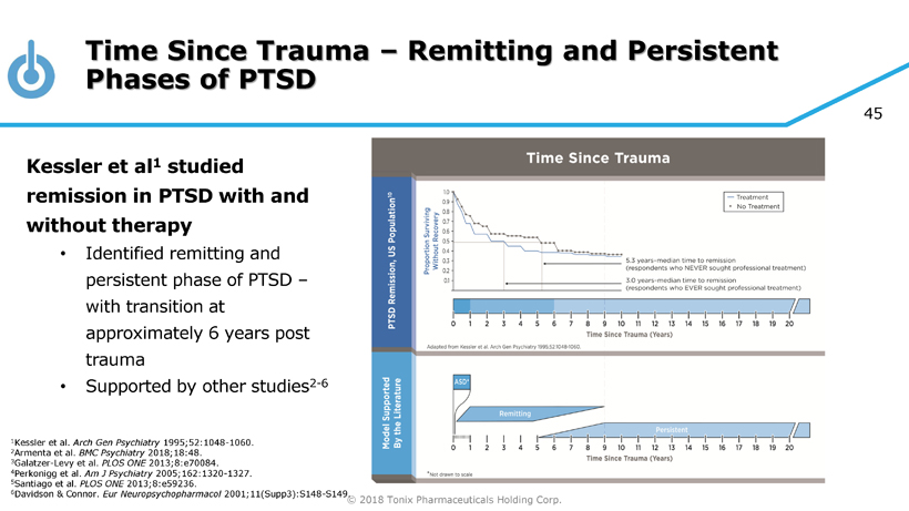 © 2018 Tonix Pharmaceuticals Holding Corp. 44 Time Since Trauma – Review of Published Studies Published studies of prazosin suggested effects in military - PTSD prior to 9 years • Loss of treatment effect >9 years Paroxetine and sertraline studies supporting FDA approval were conducted on PTSD > 9 years • SSRIs have a benefit long after trauma 1 Martenyi et al. J Clin Psychiatry 2002;63:199 - 206. 2 Friedman et al. J Clin Psychiatry 2007;68:711 - 720. 3 Raskind et al. NEJM 2018;378:507 - 517. 4 Raskind et al. Am J Psychiatry 2013;170:1003 - 1010. 5 Shalev et al. Arch Gen Psychiatry 2012;69:166 - 176. 6 Davidson et al. Arch Gen Psychiatry 2001;58:485 - 492. 7 Brady et al. JAMA 2000;283:1837 - 1844. 8 Marshall et al. Am J Psychiatry 2001;158:1982 - 1988. 9 Tucker et al. J Clin Psychiatry 2001;62:860 - 868. Escit =escitalopram