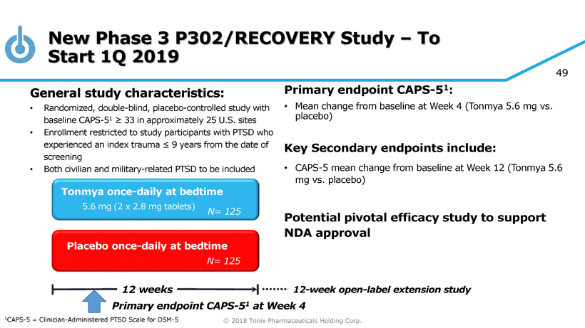 © 2018 Tonix Pharmaceuticals Holding Corp. 48 Summary of Clinical Experience with Tonmya/ TNX - 102 SL in PTSD Median time since trauma (TST) in TNX - 102 SL 5.6 mg group in the P301/HONOR study (9.5 years) was longer than P201/AtEase study (6 years) • Both studied military - related PTSD • Time has passed since the surge in Iraq In retrospective analysis, the ≤ 9 year subgroup of P301 study had similar results as the P201 study (primary and secondary) • TST is important in placebo - controlled clinical study • Potential enrichment in ≤ 9 years TST subgroup for treatment responders The ≤ 9 year subgroup of P301 may be enriched for “Remitting Phase” of PTSD 1 - 4 • Expect remitting phase of PTSD is more amenable to drug studies Results from retrospective analyses lead to improved Phase 3 study design 1 Kessler et al. Arch Gen Psychiatry 1995;52:1048 - 1060. 2 Armenta et al. BMC Psychiatry 2018;18:48. 3 Galatzer - Levy et al. PLOS ONE 2013;8:e70084. 4 Perkonigg et al. Am J Psychiatry 2005;162:1320 - 1327.