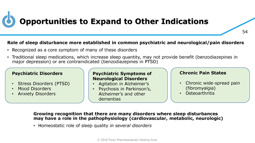 © 2018 Tonix Pharmaceuticals Holding Corp. 53 Tonmya Trazodone Trazodone (disordered sleep ), prazosin (night terrors) - Trazodone inhibits serotonin 5HT 2A receptors and serotonin reuptake (SARI) - Prazosin blocks norepinephrine a 1 receptors Prazosin SARI – S erotonin Receptor A ntagonist & R euptake I nhibitor (Stahl SM, CNS Spectrums, 2009;14:536).