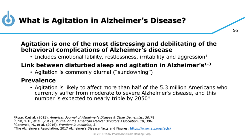 © 2018 Tonix Pharmaceuticals Holding Corp. 55 TNX - 102 SL – Bedtime Treatment for Multiple Potential Indications Ma nagement of Fibromyalgia (FM) – chronic pain condition • TNX - 102 SL studied at low dose (2.8 mg) – half the dose being developed for PTSD – did not separate from placebo on primary endpoint, average pain improvement (responder analysis) • Retrospective analysis showed average pain improvement (secondary endpoint) after 12 weeks of treatment showed statistical significance (P< 0.05, MMRM) • Low dose TNX - 102 SL (2.8 mg) showed an improvement in sleep quality in Phase 2 and Pha se 3 FM trials • Efficacy of TNX - 102 SL 5.6 mg in FM can be studied in a potential pivotal study to support product registration Agitation in Alzheimer’s Disease • Fast Track designation granted July 2018 • Phase 2/ potential pivotal efficacy study protocol received FDA comments in October 2018