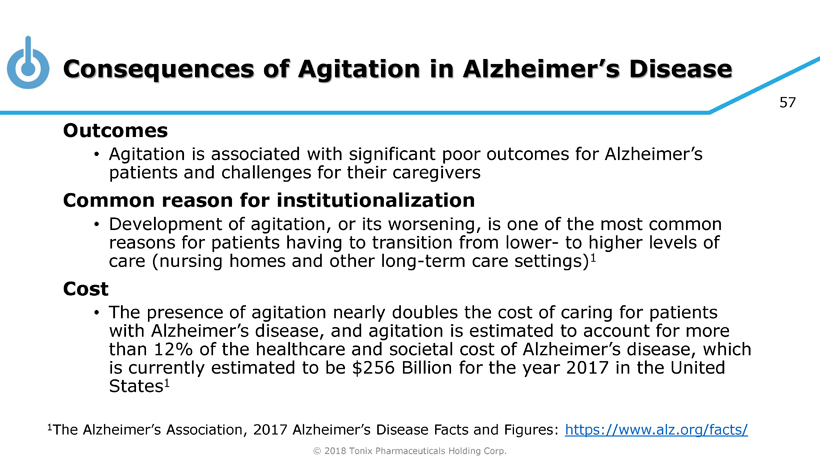 © 2018 Tonix Pharmaceuticals Holding Corp. 56 What is Agitation in Alzheimer’s Disease? Agitation is one of the most distressing and debilitating of the behavioral complications of Alzheimer’s disease • Includes emotional lability, restlessness, irritability and aggression 1 Link between disturbed sleep and agitation in Alzheimer’s 1 - 3 • Agitation is commonly diurnal (“ sundowning ”) Prevalence • Agitation is likely to affect more than half of the 5.3 million Americans who currently suffer from moderate to severe Alzheimer’s disease, and this number is expected to nearly triple by 2050 4 1 Rose, K.et al. (2015). American Journal of Alzheimer's Disease & Other Dementias , 30 :78 2 Shih, Y. H., et al. (2017). Journal of the American Medical Directors Association , 18 , 396. 3 Canevelli, M., et al. (2016). Frontiers in medicine , 3 . 4 The Alzheimer’s Association, 2017 Alzheimer’s Disease Facts and Figures: https://www.alz.org/facts/