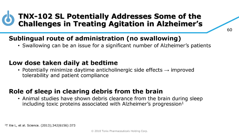 © 2018 Tonix Pharmaceuticals Holding Corp. 59 TNX - 102 SL for Agitation in Alzheimer’s – Regulatory Status and Registration Strategy FDA confirmed no additional study is needed prior to IND submission • Pre - IND meeting established open dialogue with the FDA on pivotal clinical study design and efficacy endpoints to support product registration Proposed Phase 2 IND study can potentially serve as a pivotal efficacy study to support NDA approval • FDA comments on final protocol received October 2018 Registration Strategy of TNX - 102 SL for agitation in Alzheimer’s disease • Efficacy Supplement (sNDA 1 ) may be leveraged from the PTSD/FM development program and supported by Initial NDA approval for PTSD/FM 1 Supplemental New Drug Application