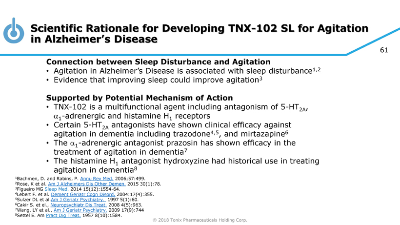 © 2018 Tonix Pharmaceuticals Holding Corp. 61 Scientific Rationale for Developing TNX - 102 SL for Agitation in Alzheimer’s Disease Connection between Sleep Disturbance and Agitation • Agitation in Alzheimer’s Disease is associated with sleep disturbance 1,2 • Evidence that improving sleep could improve agitation 3 Supported by Potential Mechanism of Action • TNX - 102 is a multifunctional agent including antagonism of 5 - HT 2A , a 1 - adrenergic and histamine H 1 receptors • Certain 5 - HT 2A antagonists have shown clinical efficacy against agitation in dementia including trazodone 4,5 , and mirtazapine 6 • The a 1 - adrenergic antagonist prazosin has shown efficacy in the treatment of agitation in dementia 7 • The histamine H 1 antagonist hydroxyzine had historical use in treating agitation in dementia 8 1 Bachmen, D. and Rabins , P. Annu Rev Med. 2006;57:499. 2 Rose, K et al. Am J Alzheimers Dis Other Demen . 2015 30(1):78. 3 Figueiro MG Sleep Med. 2014 15(12):1554 - 64. 4 Lebert F. et al. Dement Geriatr Cogn Disord . 2004:17(4):355. 5 Sulzer DL et al. Am J Geriatr Psychiatry. 1997 5(1):60. 6 Cakir S. et el., Neuropsychiatr Dis Treat. 2008 4(5):963. 7 Wang, LY et al., Am J Geriatr Psychiatry. 2009 17(9):744 8 Settel E. Am Pract Dig Treat. 1957 8(10):1584.