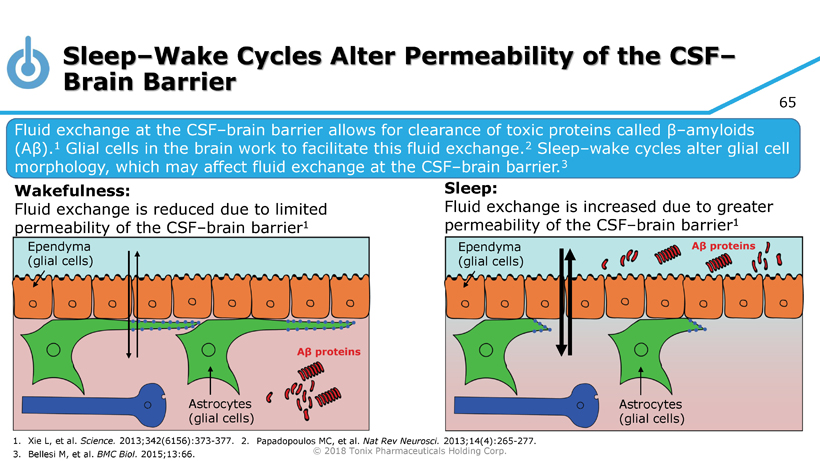 © 2018 Tonix Pharmaceuticals Holding Corp. 64 During Sleep, the CSF – Brain Barrier Is More Permeable, Allowing Debris to Clear Aβ = β - amyloid CSF = Cerebrospinal Fluid 1. Bellesi M, et al. BMC Biol. 2015;13:66. 2. Xie L, et al. Science. 2013;342(6156):373 - 377. Permeability of CSF – brain barrier is increased during sleep 2 Astrocytes change shape, promoting fluid exchange 1 Extracellular volume increases during sleep 2