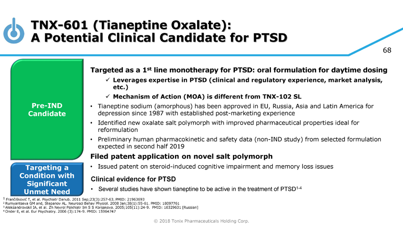© 2018 Tonix Pharmaceuticals Holding Corp. 68 TNX - 601 ( Tianeptine Oxalate): A Potential Clinical Candidate for PTSD Pre - IND Candidate Targeted as a 1 st line monotherapy for PTSD: oral formulation for daytime dosing x Leverages expertise in PTSD (clinical and regulatory experience, market analysis, etc.) x Mechanism of Action (MOA) is different from TNX - 102 SL • Tianeptine sodium (amorphous) has been approved in EU, Russia, Asia and Latin America for depression since 1987 with established post - marketing experience • Identified new oxalate salt polymorph with improved pharmaceutical properties ideal for reformulation • Preliminary human pharmacokinetic and safety data (non - IND study) from selected formulation expected in second half 2019 Filed patent application on novel salt polymorph • Issued patent on steroid - induced cognitive impairment and memory loss issues Targeting a Condition with Significant Unmet Need Clinical evidence for PTSD • Several studies have shown tianeptine to be active in the treatment of PTSD 1 - 4 1 Frančišković T, et al. Psychiatr Danub . 2011 Sep;23(3):257 - 63. PMID: 21963693 2 Rumyantseva GM and, Stepanov AL. Neurosci Behav Physiol. 2008 Jan;38(1):55 - 61. PMID: 18097761 3 Aleksandrovskiĭ IA, et al. Zh Nevrol Psikhiatr Im S S Korsakova . 2005;105(11):24 - 9. PMID: 16329631 [Russian] 4 Onder E, et al. Eur Psychiatry. 2006 (3):174 - 9. PMID: 15964747