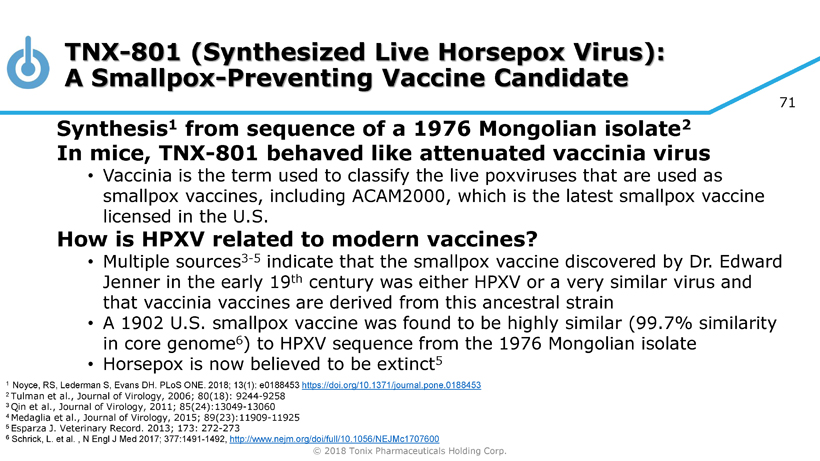 © 2018 Tonix Pharmaceuticals Holding Corp. 71 TNX - 801 (Synthesized Live Horsepox Virus): A Smallpox - Preventing Vaccine Candidate Synthesis 1 from sequence of a 1976 Mongolian isolate 2 In mice, TNX - 801 behaved like attenuated vaccinia virus • Vaccinia is the term used to classify the live poxviruses that are used as smallpox vaccines, including ACAM2000, which is the latest smallpox vaccine licensed in the U.S. How is HPXV related to modern vaccines? • Multiple sources 3 - 5 indicate that the smallpox vaccine discovered by Dr. Edward Jenner in the early 19 th century was either HPXV or a very similar virus and that vaccinia vaccines are derived from this ancestral strain • A 1902 U.S. smallpox vaccine was found to be highly similar (99.7% similarity in core genome 6 ) to HPXV sequence from the 1976 Mongolian isolate • Horsepox is now believed to be extinct 5 1 Noyce, RS, Lederman S, Evans DH. PLoS ONE. 2018; 13(1): e0188453 https://doi.org/10.1371/journal.pone.0188453 2 Tulman et al., Journal of Virology, 2006; 80(18): 9244 - 9258 3 Qin et al., Journal of Virology, 2011; 85(24):13049 - 13060 4 Medaglia et al., Journal of Virology, 2015; 89(23):11909 - 11925 5 Esparza J. Veterinary Record. 2013; 173: 272 - 273 6 Schrick , L. et al. , N Engl J Med 2017; 377:1491 - 1492, http://www.nejm.org/doi/full/10.1056/NEJMc1707600