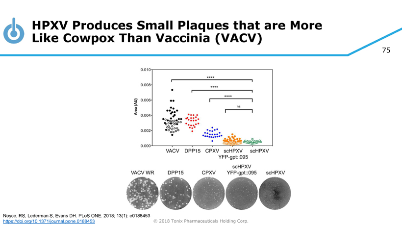 74 © 2018 Tonix Pharmaceuticals Holding Corp. Sequence: GenBank entry DQ792504; DNA: GeneArt Genome Assembly (212 kbp ) by Synthesis of Fragments and Construction of Telomeres Noyce, RS, Lederman S, Evans DH. PLoS ONE. 2018; 13(1): e0188453 https://doi.org/10.1371/journal.pone.0188453