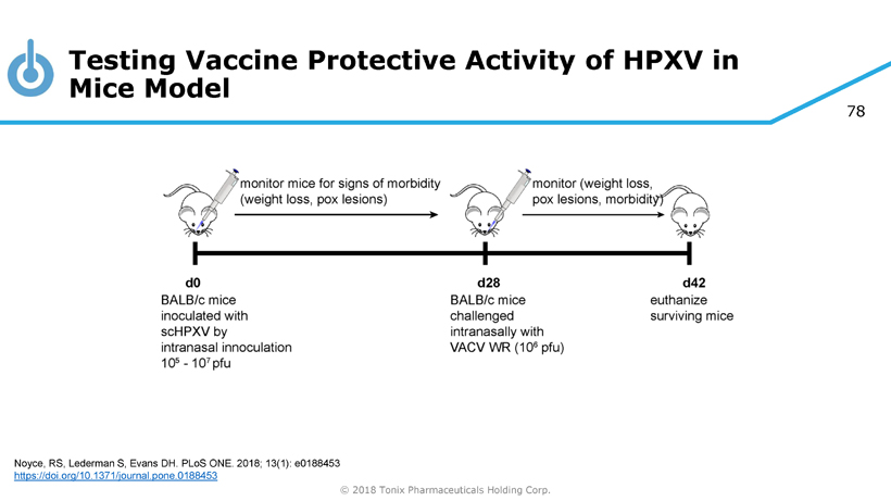 78 © 2018 Tonix Pharmaceuticals Holding Corp. Testing Vaccine Protective Activity of HPXV in Mice Model Noyce, RS, Lederman S, Evans DH. PLoS ONE. 2018; 13(1): e0188453 https://doi.org/10.1371/journal.pone.0188453
