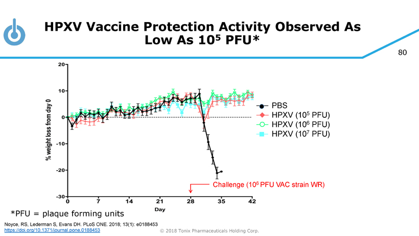 79 © 2018 Tonix Pharmaceuticals Holding Corp. PBS VACV WR (5x10 3 PFU) Dryvax clone (10 7 PFU) HPXV (10 7 PFU) Challenge (10 6 PFU VAC strain WR) Biological Properties of HPXV: Less Virulent than a Dryvax Clone, but Produces Protective Immunity Noyce, RS, Lederman S, Evans DH. PLoS ONE. 2018; 13(1): e0188453 https://doi.org/10.1371/journal.pone.0188453