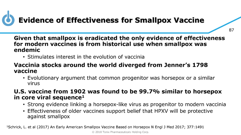 © 2018 Tonix Pharmaceuticals Holding Corp. 86 Live virus vaccines stimulate cross - reactive immunity • Protects from possible infection with smallpox virus • Renders recipient “immune” • Provides indirect protection to non - immunized population “herd immunity” Potential safety improvement over existing vaccines • Cardiotoxicity limits widespread smallpox vaccination in at - risk population Exclusivity • Patent application filed on novel virus composition • 12 years exclusivity can be anticipated Eligibility for Priority Review Voucher upon licensure if accepted as medical counter - measure Mechanism of Action Possible advantages of TNX - 801 TNX - 801 (HPVX) • Synthesized live horsepox virus • Shares structural characteristics with vaccinia - based smallpox vaccines • Unique properties that suggest lower toxicity TNX - 801 (Synthesized Live Horsepox Virus): A Smallpox - Preventing Vaccine Candidate