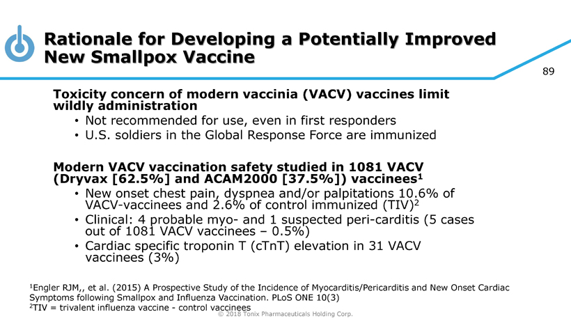 © 2018 Tonix Pharmaceuticals Holding Corp. 89 Toxicity concern of modern vaccinia (VACV) vaccines limit wildly administration • Not recommended for use, even in first responders • U.S. soldiers in the Global Response Force are immunized Modern VACV vaccination safety studied in 1081 VACV ( Dryvax [62.5%] and ACAM2000 [37.5%]) vaccinees 1 • New onset chest pain, dyspnea and/or palpitations 10.6% of VACV - vaccinees and 2.6% of control immunized (TIV) 2 • Clinical: 4 probable myo - and 1 suspected peri - carditis (5 cases out of 1081 VACV vaccinees – 0.5%) • Cardiac specific troponin T ( cTnT ) elevation in 31 VACV vaccinees (3%) Rationale for Developing a Potentially Improved New Smallpox Vaccine 1 Engler RJM,, et al. (2015) A Prospective Study of the Incidence of Myocarditis/Pericarditis and New Onset Cardiac Symptoms following Smallpox and Influenza Vaccination. PLoS ONE 10(3) 2 TIV = trivalent influenza vaccine - control vaccinees