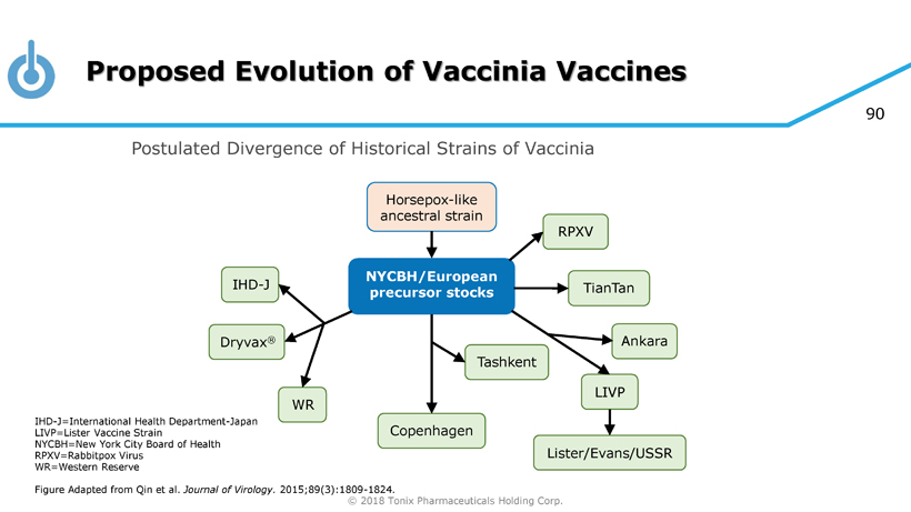 © 2018 Tonix Pharmaceuticals Holding Corp. 90 Postulated Divergence of Historical Strains of Vaccinia Proposed Evolution of Vaccinia Vaccines NYCBH/European precursor stocks Horsepox - like ancestral strain Lister/Evans/USSR Dryvax ® IHD - J WR Copenhagen Tashkent RPXV TianTan Ankara LIVP IHD - J=International Health Department - Japan LIVP=Lister Vaccine Strain NYCBH=New York City Board of Health RPXV=Rabbitpox Virus WR=Western Reserve Figure Adapted from Qin et al. Journal of Virology. 2015;89(3):1809 - 1824.