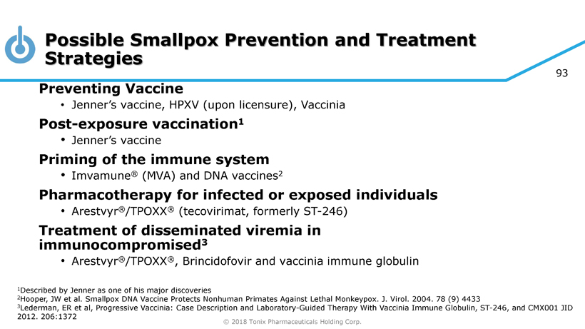 © 2018 Tonix Pharmaceuticals Holding Corp. 92 Theoretical effectiveness of modern vaccinia vaccines are based on extrapolation from older vaccines • Newer/modern vaccines were not widely used when smallpox was endemic MVA ( Modified Virus Ankara) which has large deletions also produces different T cell responses • In non - human primates, MVA is less effective than ACAM2000 in protecting against monkeypox 1 • MVA has fewer epitopes, and elicits different responses to existing epitopes 2 • MVA effectiveness argument is based on the immune response to intracellular mature virus (IMV) • Immunity to the other form of virus, extracellular enveloped virus (EEV), is weak because the immunodominant B5 gene is heavily mutated and deleted in MVA What’s the Evidence of Effectiveness of Smallpox Vaccines for Preventing Smallpox? 1 Golden JW, et al. (2012). PLoS ONE 7(7): e42353. doi:10.1371/journal.pone.0042353 2 Tscharke, DC et al., J. Exp. Med. 2005 201(1):95