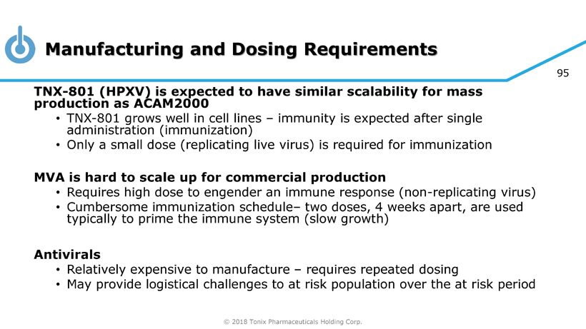 © 2018 Tonix Pharmaceuticals Holding Corp. 94 Pox vaccines with low or no replication appear safer than vaccines replicate fast in human cells • Canarypox and Imvamune ® (Modified Virus Ankara/MVA) appear to have good tolerability • Relatively safe in immunocompromised hosts • Rapidly replicating modern vaccinia vaccines ( Dryvax ® and ACAM2000®) are associated with myocarditis Replication correlates positively with immunogenicity • Jenner’s vaccine and modern vaccinia engender strong immunity • Canarypox and MVA appear to be weak immunogens, suitable for priming of the immune system in healthy human being and potentially safe enough to use in immunocompromised people Viral Replication Proficiency is Critical to Human Immunogenicity but May Compromise Safety