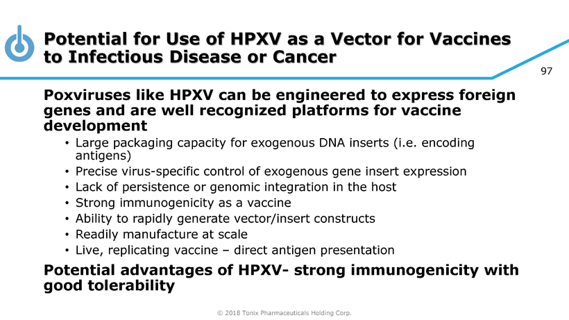 © 2018 Tonix Pharmaceuticals Holding Corp. 97 Potential for Use of HPXV as a Vector for Vaccines to Infectious Disease or Cancer Poxviruses like HPXV can be engineered to express foreign genes and are well recognized platforms for vaccine development • Large packaging capacity for exogenous DNA inserts (i.e. encoding antigens) • Precise virus - specific control of exogenous gene insert expression • Lack of persistence or genomic integration in the host • Strong immunogenicity as a vaccine • Ability to rapidly generate vector/insert constructs • Readily manufacture at scale • Live, replicating vaccine – direct antigen presentation Potential advantages of HPXV - strong immunogenicity with good tolerability