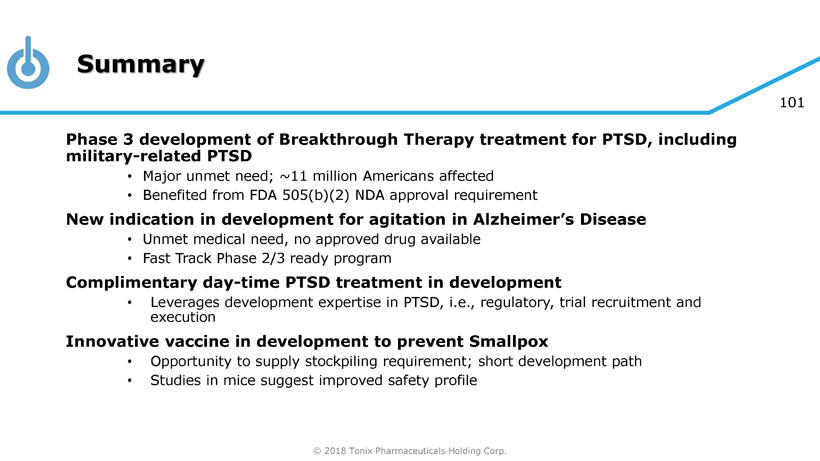 © 2018 Tonix Pharmaceuticals Holding Corp. 100 Milestones – Recently Completed and Upcoming □ July 201 8 Completed P301/HONOR study interim analysis - result did not support study continuation but strengthened new Phase 3 study □ August 201 8 Presentation of P301/HONOR study results at Military Health System Scientific Symposium □ October 201 8 Met with FDA and received preliminary agreement on the design of new Phase 3 study of Tonmya for PTSD (P302/RECOVERY study) □ November 201 8 Received FDA minutes confirming agreement on the design of P302/RECOVERY study □ First Quarter 2019 P302/RECOVERY study to be initiated □ Second Half 2019 P reliminary human pharmacokinetic and safety data (non - IND study) from selected TNX - 601 (tianeptine oxalate) formulation expected □ First Half 2020 Topline data from P302/RECOVERY study expected x x x x