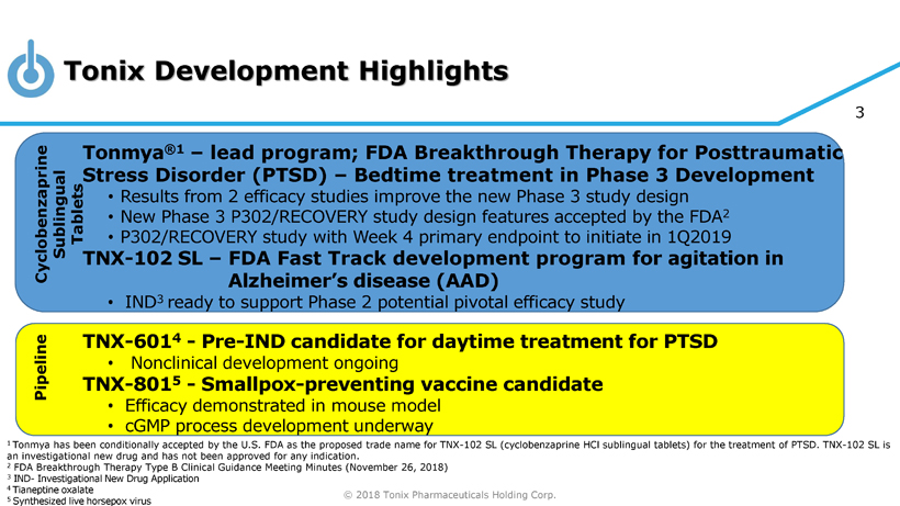 © 2018 Tonix Pharmaceuticals Holding Corp. 2 Cautionary Note on Forward - Looking Statements Certain statements in this presentation regarding strategic plans, expectations and objectives for future operations or results are “forward - looking statements” as defined by the Private Securities Litigation Reform Act of 1995 . These statements may be identified by the use of forward - looking words such as “anticipate,” “believe,” “forecast,” “estimate” and “intend,” among others . These forward - looking statements are based on Tonix’s current expectations and actual results could differ materially . There are a number of factors that could cause actual events to differ materially from those indicated by such forward - looking statements . These factors include, but are not limited to, substantial competition ; our need for additional financing ; uncertainties of patent protection and litigation ; uncertainties of government or third party payor reimbursement ; limited research and development efforts and dependence upon third parties ; and risks related to failure to obtain U . S . Food and Drug Administration clearances or approvals and noncompliance with its regulations . As with any pharmaceutical under development, there are significant risks in the development, regulatory approval and commercialization of new products . The forward - looking statements in this presentation are made as of the date of this presentation, even if subsequently made available by Tonix on its website or otherwise . Tonix does not undertake an obligation to update or revise any forward - looking statement, except as required by law . Investors should read the risk factors set forth in the Annual Report on Form 10 - K for the year ended December 31 , 2017 , as filed with the Securities and Exchange Commission (the “SEC”) on March 9 , 2018 , and periodic reports filed with the SEC on or after the date thereof . All of Tonix's forward - looking statements are expressly qualified by all such risk factors and other cautionary statements .