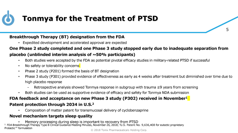© 2018 Tonix Pharmaceuticals Holding Corp. 4 Candidates in Development Preclinical Phase 2 NDA 1 /BLA 2 Market Pipeline Product Indication/ Description Phase 3 Tonmya Bedtime Treatment for PTSD Daytime Treatment for PTSD TNX - 601 Novel polymorph and salt discovered and characterized; Preliminary human PK and safety data 3 from selected formulation expected 2H2019 TNX - 801 Horsepox virus synthesized and demonstrated protective vaccine activity in mice Smallpox - preventing vaccine Cyclobenzaprine HCl sublingual tablets Tianeptine oxalate oral formulation Live horsepox virus (HPXV) vaccine from cell culture Phase 1 1 NDA - New Drug Application; 2 BLA – Biologic Licensing Application; 3 non - IND study Bedtime Treatment for Agitation in Alzheimer’s Cyclobenzaprine HCl sublingual tablets Fast Track Phase 2/3 ready program TNX - 102 SL All programs owned outright with no royalties or other obligations due P302/ RECOVERY study to start 1Q2019