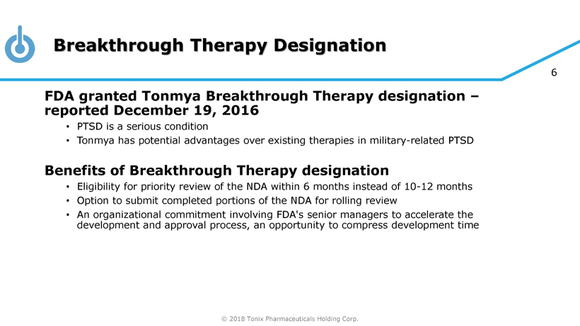 © 2018 Tonix Pharmaceuticals Holding Corp. 5 Tonmya for the Treatment of PTSD Breakthrough Therapy (BT) designation from the FDA • Expedited development and accelerated approval are expected One Phase 2 study completed and one Phase 3 study stopped early due to inadequate separation from placebo (unblinded interim analysis of ~50% participants) • Both studies were accepted by the FDA as potential pivotal efficacy studies in military - related PTSD if successful • No safety or tolerability concerns • Phase 2 study (P201) formed the basis of BT designation • Phase 3 study (P301) provided evidence of effectiveness as early as 4 weeks after treatment but diminished over time due to high placebo response − Retrospective analysis showed Tonmya response in subgroup with trauma ≤9 years from screening • Both studies can be used as supportive evidence of efficacy and safety for Tonmya NDA submission FDA feedback and acceptance on new Phase 3 study (P302) received in November 1 Patent protection through 2034 in U.S. 2 • Composition of matter patent for transmucosal delivery of cyclobenzaprine Novel mechanism targets sleep quality • Memory processing during sleep is important to recovery from PTSD 1 FDA Breakthrough Therapy Type B Clinical Guidance Meeting Minutes, November 26, 2018; 2 U .S. Patent No. 9,636,408 for eutectic proprietary Protectic ™ formulation
